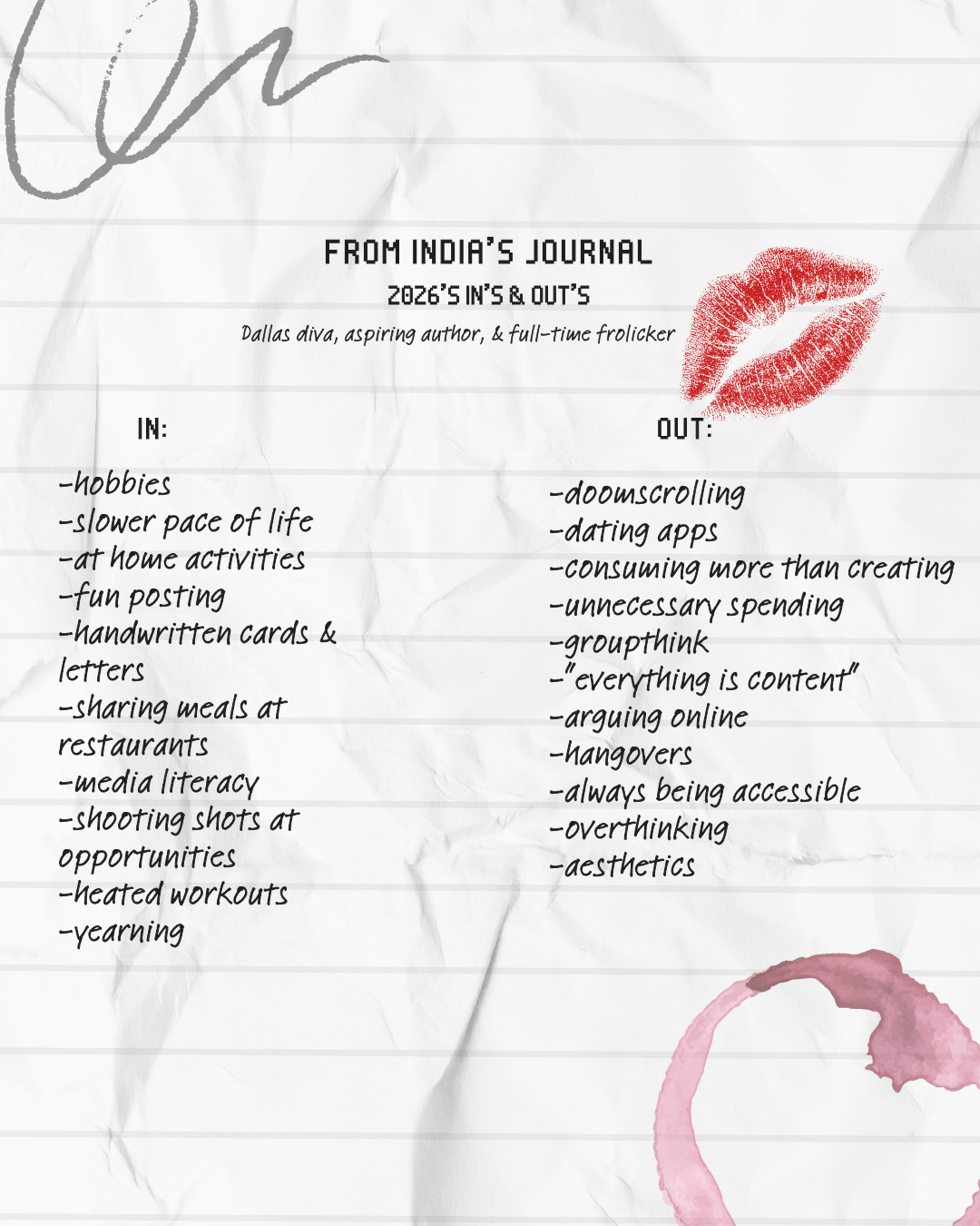 Being snowed in for a week in Dallas also gave me time to think. Thankfully, I didn’t lose heat or power, and I had the opportunity to pause. In the house, without the pressure to leave, and everybody in the city being forced to sit down, gave me peace. It felt like the whole world was on pause. I took a mini social media break, meaning I turned on my app limits and cut my doom scrolling to 50%. In my time, I was able to sit in true silence, like, for real. No music. No hootin’ and hollerin’. No talking on the phone. No nothing. I cracked open my new Midori journal and started to write. I made my 2026 bingo card, I did some prompts, and really sat with myself to truly think. Thinking out loud, I don’t think I’ve done that at all recently, and it was needed because it allowed me time to try to really figure out what I want next in life. This just made me feel at peace as I’m skiing into the new year.